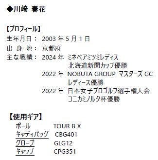 7月18日~21日にザ・クイーンズヒルゴルフクラブ(福岡県)で行われた国内女子ツアー、「大東建託・いい部屋ネットレディス」において、首位からスタートしたボール・用品契約の川崎春花が、最終日8バーディ、ノーボギーの64でプレーし、通算28アンダーとして、2試合連続優勝を果たしました。また、このスコアは、国内女子ツアーにおける4日間競技のツアー新記録となりました。なお、6位Tにはボール契約の藤田さいきと仲村果乃が入り、ブリヂストンスポーツがサポートするアマチュアの荒木優奈がベストアマチュア賞(9位)を獲得しました。