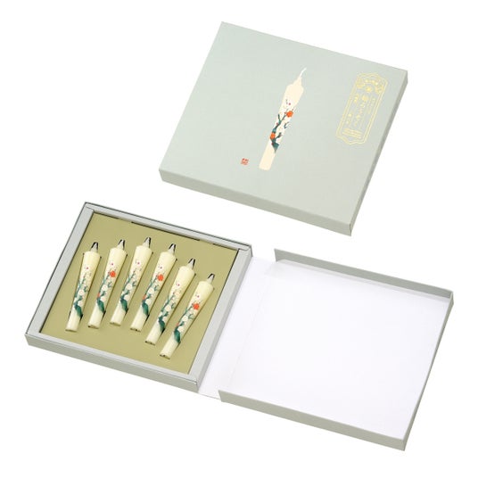 せっかくいただいた絵ろうそくを「もったいなくて使えない」と観賞用にしてしまわないように、源平咲き3本・白梅3本の絵柄をセットしました。美しさはそのままに、使い勝手がよく惜しみなく灯せる絵ろうそくです。
