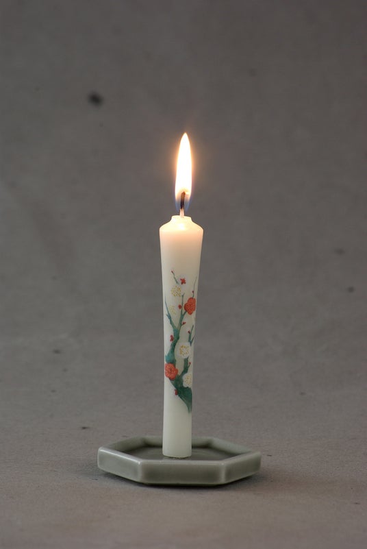 屏風絵を思わせる、源平(※)に咲く梅が美しい天然蜜蝋配合の絵ろうそく。古式ゆかしき和ろうそくの佇まいそのままに、扱いやすい洋ろうそくの製法で作り上げました。
