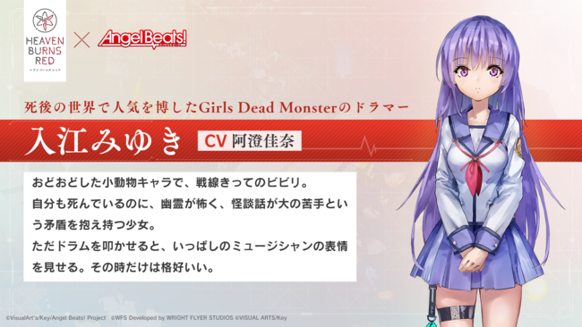 コラボでは『Angel Beats!』より仲村ゆり、立華かなで、入江みゆきが登場し、Key麻枝 准 完全書き下ろしの新たな『Angel Beats!』の物語となっています。さらに『Angel Beats!』に登場するガールズバンド「Girls Dead Monster」の曲を、『ヘブンバーンズレッド』内に登場する第31A部隊メンバーのバンド「She is Legend」がカバーします。カバー曲もコラボシナリオで聞くことができますので、ぜひお楽しみください。