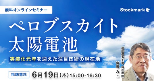 最先端の自然言語処理AIを活用した情報収集サービス『Anews・Astrategy』を提供するストックマーク株式会社(以下、「当社」)はオンラインセミナー『ペロブスカイト太陽電池 - 実装化元年を迎えた注目技術の現在地』を6月19日(木) に開催致します。