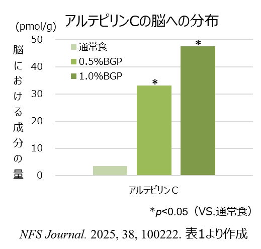 BGPを摂取させた2群では、通常食を摂取させた群と比較して、脳におけるアルテピリンCが有意に高い濃度で検出されました。