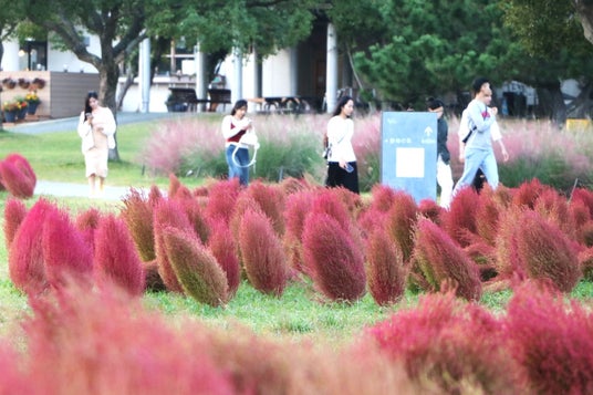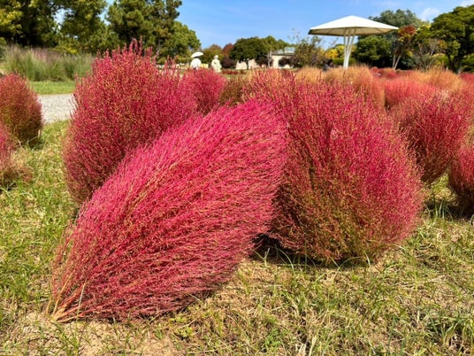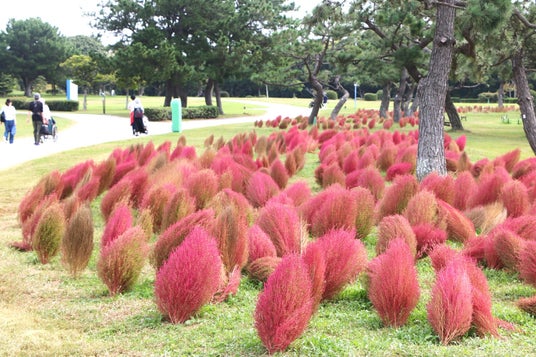 福岡県福岡市に位置する国営海の中道海浜公園では、虹・彩りの花壇にて、2,000株のコキアが紅葉の見頃を迎えています。見頃は今月いっぱい続く見込みです。真ん丸モコモコな姿のイメージですが、今年は台風の影響を受けるなどして、曲がったり尖ったりと、個性あふれる形に仕上がりました。その様子はさながら、ゆらめく炎のよう。すぐ近くに植栽されているミューレンベルギア・カピラリスの、穏やかに揺れる赤い穂波との対比も美しいです。