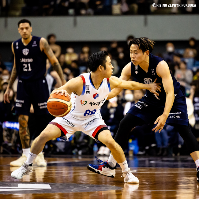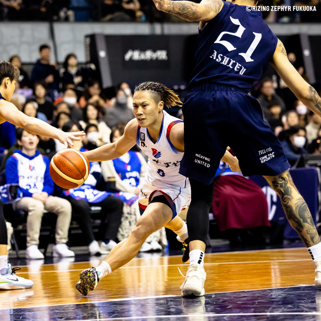 リードを握られるものの、点差は最大で9点差の前半戦。ここから連続得点で2点差まで詰め寄るなど離されても必ず食らいつく。A千葉の速いでフェンスの寄りにも対応し、クイックなスリーを連発。#24谷口、#12寒竹、さらに#33加藤のディープスリーでライジングらしいオフェンスが見られた。