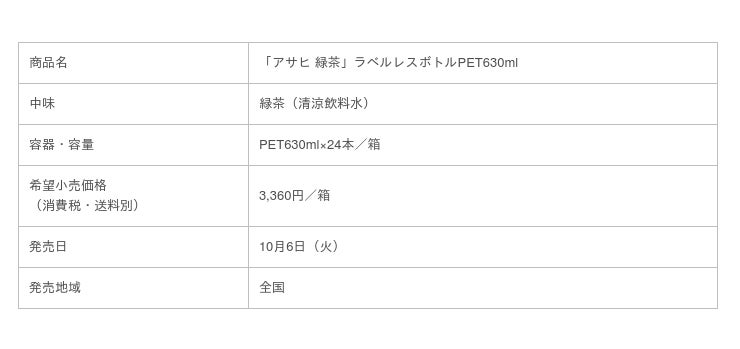 アサヒ飲料株式会社(本社 東京、社長 米女 太一)は、ラベルレスボトル専用で「アサヒ 緑茶」ラベルレスボトルPET630mlを10月6日(火)より全国で発売します。「アサヒ 緑茶」は、アサヒ飲料として初めて、ラベルレスボトル商品のみで発売するブランドです。