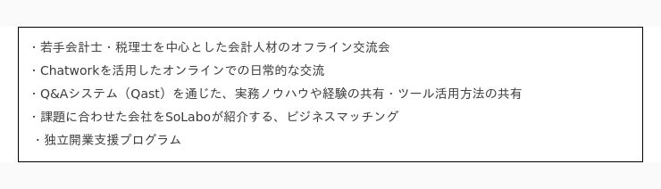 このような課題を解決できる場として、SoLaboが提供している会計士・税理士を中心とする会計人材を対象としたコミュニティです。 コミュニティ内では、下記を一例とした交流会やノウハウ共有を実施予定です。