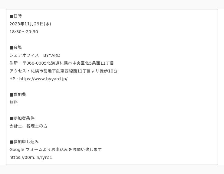 株式会社SoLabo(本社:東京都千代田区、代表取締役:田原広一)は、税理士又は会計士を対象とした、実務家向けコミュニティ「ふらっと」を運営しています。「ふらっと」では、地方の情報格差を無くすべく日本各地でイベントを実施いたします。この度、2023年11月29日(水)に北海道札幌市にて交流会の開催が決定いたしました。
