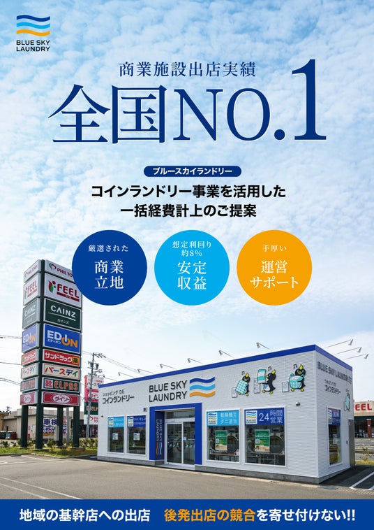 ◇ブルースカイランドリーについて全国に300店舗以上を展開するコインランドリーフランチャイズチェーンで、効果的な立地戦略や運営サポートを強みとし、商業施設内への出店に特化することで利便性を高めています。また、「コインランドリーのあるライフスタイル」をブランドコンセプトとして掲げ、共働き世帯や天候不順の影響により増加する需要に応える形で、地域の生活に根ざしたサービスを提供しています。