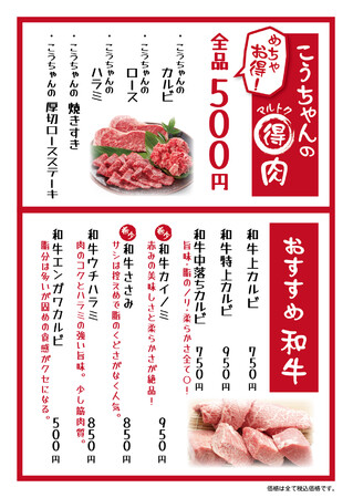 こうちゃんのこだわりのおすすめ和牛は全てA5ランクの黒毛和牛を使用で全て1000円以下!