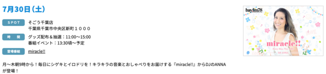 7月30日(土)キラキラの音楽とおしゃべりをお届けする『miracle!!』からDJのANNAが登場!