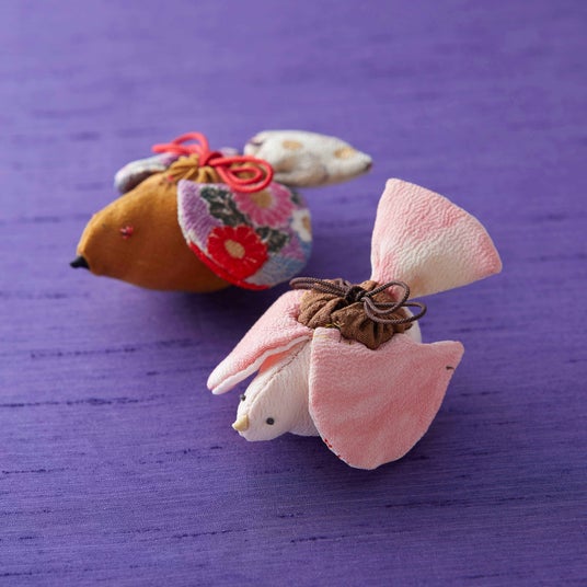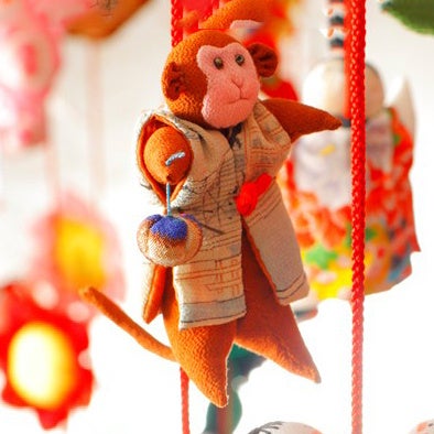 約3メートル高さから、幅5メートル、奥行きの2メートルの空間で本絹古布の手縫いのお細工物を約5000個つるす「つるし飾り」は、子どもたちの健やかな成長を願って飾る縁起物です。江戸時代から始まった風習とされ、飾りの形には、花は「かわいくなるように」、這(は)い子人形は「這えば立て、立てば歩めの親心」、五穀豊穣(ごこくほうじょう)を表す雀(すずめ)は「食に恵まれて丈夫になるように」、猿は「災いが去るように」などそれぞれ意味があります。