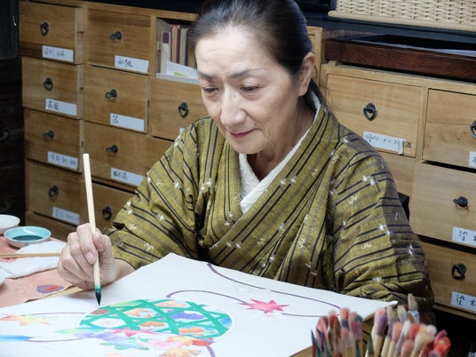 着物を染める伝統工芸、「手描友禅染」で小さな布を染めるワークショップです。柄の描いてある生地に好きな色を染めていく体験ができます。