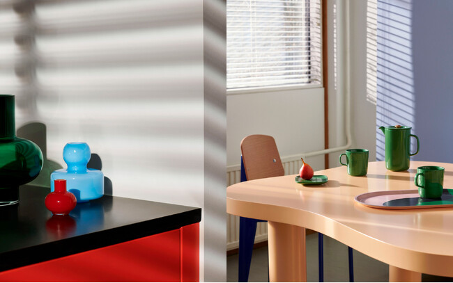 ジェリービーングリーンのテーブルウェアやポピーレッドのフラワーベース、ミッドナイトブルーのベッドアイテムなど、暮らしを彩るアイテムを幅広くラインナップ。部屋に1アイテム取り入れるだけで空間がモダンで洗練された印象に。
