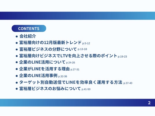 本レポートでは、業界別の事例や弊社の実績をもとに具体的なLINEの活用方法を理解していただけます。富裕層向けビジネスでLINEを用いた効果的なLTV向上をご検討されている方におすすめの内容です。