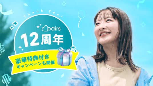 株式会社エウレカ(本社:東京都港区、代表取締役CEO:山本竜馬、以下 ペアーズ)は、運営する恋活・婚活マッチングアプリ「Pairs(ペアーズ)」が、2012年のサービス開始から2024年10月で12周年を迎えたことを記念して、ペアーズの男性有料会員プラン(3ヶ月以上)を新たに購入した方に特典を提供する「ペアーズ 12周年キャンペーン」を、10月31日から11月17日の期間に実施すると発表しました。