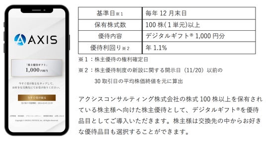 アクシスコンサルティング株式会社(代表取締役社長COO:伊藤 文隆、東証グロース市場:証券コード9344)において、株式会社デジタルプラス(代表取締役社長:菊池 誠晃、本社:東京都渋谷区、東証グロース市場:証券コード3691)グループが運営する「デジタルギフト(R)」を株主優待としてご活用いただくことになりました。