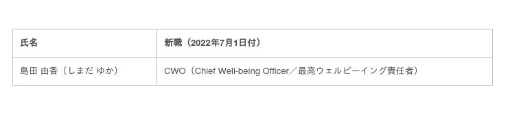 初代CWOには、ユニリーバ・ジャパンや株式会社YeeY、一般社団法人dialogueなどの団体を通じて、企業におけるウェルビーイングの在り方を長年追求してきた島田由香が着任。ワーケーションの推進や、ポジティブ心理学を用いたチームづくりなどの多様な働き方の提案を行うことで、アステリアの社員や家族のウェルビーイングの向上を図り、また日本企業の環境に即したウェルビーイングの在り方についても研究し広く発信を行います。