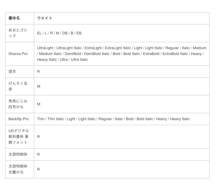 じゅん(4ウエイト)、フォーク(4ウエイト)、丸フォーク(4ウエイト)、解ミン 宙(4ウエイト)、解ミン 月(4ウエイト)、タカハンド(5ウエイト)、毎日新聞明朝(1ウエイト)、毎日新聞ゴシック(1ウエイト)