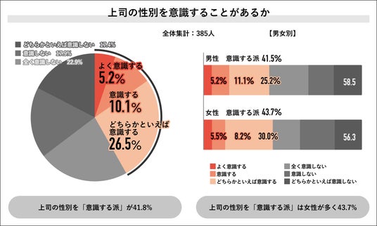 回答者全体の385人に、普段上司の性別を意識することがあるかを聞くと、「意識する派」が41.8%となり、内訳は「よく意識する」が5.2%、「意識する」が10.1%、「どちらかといえば意識する」が26.5%となりました。「上司の性別を意識する派」の男女別では、女性が43.7%、男性が41.5%となりました。