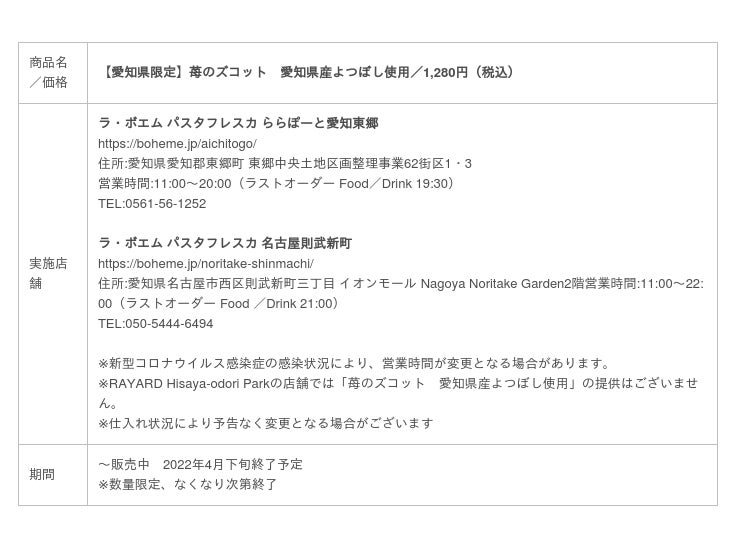 国内、L.A.に45店舗のレストランを展開をしている株式会社グローバルダイニング(本社:東京都港区南青山7丁目/代表取締役社長:長谷川耕造)は、パスタ専門店「ラ・ボエム パスタフレスカ」にて、ブランド苺「よつぼし」を使用した「苺のズコット」を、提供開始いたしました。