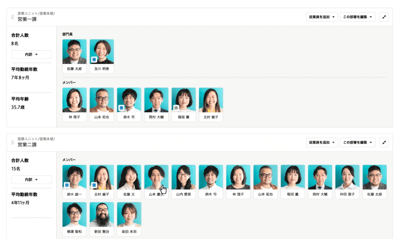 労務管理機能や人事評価などの機能により「SmartHR」に蓄積された情報を活用し、従業員の顔写真をドラッグアンドドロップすることで直感的な人員配置のシミュレーションが可能な機能です。決まった配置は、従業員データベースや組織図へ簡単に反映できます。