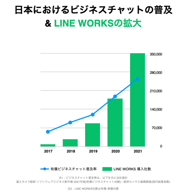 2017年に提供開始した「LINE WORKS」の導入社数・利用者数は、ビジネスコミュニケーションを円滑にする様々な機能を拡充する中で、2019年に5万社・100万ユーザーを超え、2021年には35万社・400万ユーザー※1の規模に拡大しました。これは、他社サービスを含めた国内における有償ビジネスチャット普及率※2を上回る成長となります。