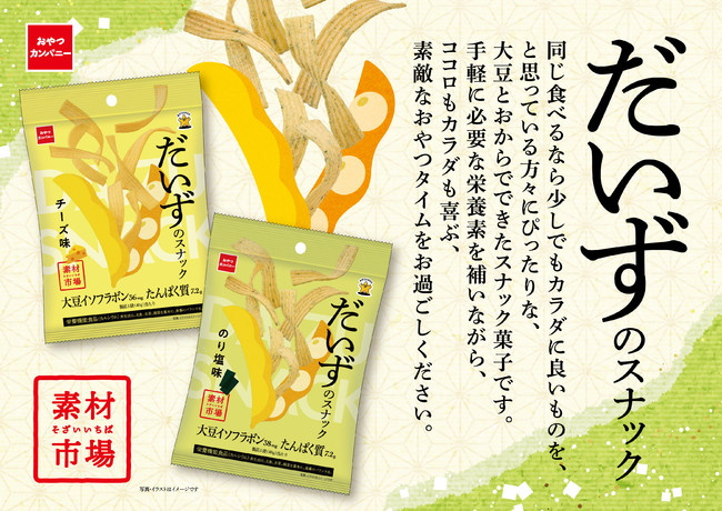 “天然のサプリメント”といわれるほど大豆には、大豆イソフラボン、植物性のタンパク質、カルシウムなどの栄養素がたっぷり含まれています。そんな栄養豊富な大豆とおからを使った『素材市場 だいずのスナック』はカリッサクッとした軽快な食感でスナック菓子らしい味わいながら大豆の栄養成分も摂れるヘルシー感覚のおやつです。味は、スナック菓子の人気フレーバーの「チーズ味」と「のり塩味」の2種類。大豆の素材本来の味わいにマッチしたチーズの風味とのり塩の風味が食欲をそそり、女性はもちろんのこと、育ち盛りのお子様も食べやすい満足感ある味わいに仕上げています。