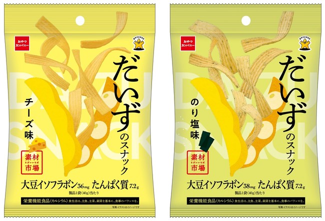 この「おやつのチカラ」シリーズとして、不足しがちな大豆イソフラボン・タンパク質・カルシウムの栄養素が摂れる栄養機能食品のスナック菓子『素材市場 だいずのスナック(チーズ味/のり塩味)』を、2022年4月4日(月)より全国にて発売します。