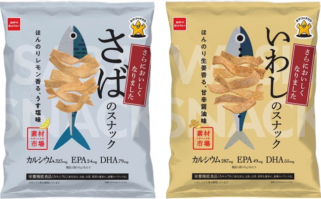 魚に含まれるカルシウム、EPA、DHAの栄養素を手軽に摂れる『素材市場 さばのスナック』『素材市場 いわしのスナック』が、さらに美味しくなって、リニューアル発売します。