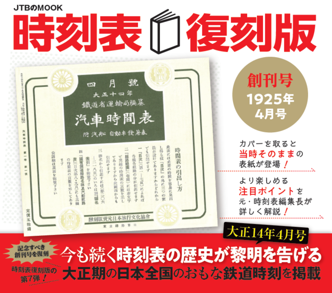 JTBグループで旅行・ライフスタイル情報を提供する株式会社JTBパブリッシング(東京都新宿区、代表取締役 社長執行役員:盛崎宏行)は、ご好評いただいている「時刻表復刻版」の第7弾として、2022年9月13日(火)に「時刻表復刻版 1925年4月号[創刊号]」を発売します。
