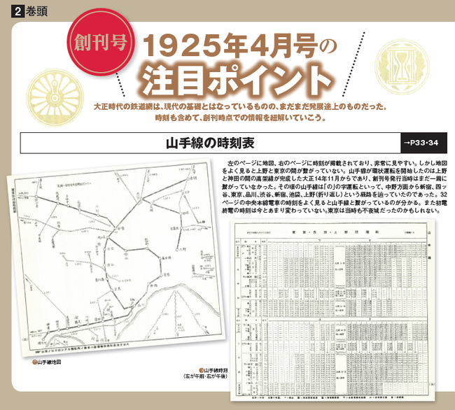 当時、駅待合室などに常備されていた鉄道省の業務用時刻表を一般向け販売したのが鉄道省運輸局編纂の『汽車時間表』。この時刻表が今なお続く『JTB時刻表』の創刊号となりました。今となっては当たり前となった「算用数字」・「左横書き」の採用、「記号」を用いた弁当販売駅・赤帽所在駅など、当時としては画期的な紙面でした。まだ山手線が環状線ではない時代。汽車がどのような路線を、どのようなダイヤで走っていたのか、大正後期の時刻を知ることができる貴重な資料を鉄道開業150年の今年、復刻します。