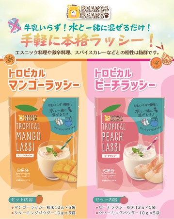 生活関連用品の企画・開発・販売を行う株式会社ドウシシャ(大阪本社:大阪市中央区、代表取締役社長:野村 正幸、以下 ドウシシャ)は、本格的なラッシーを簡単に作ることが出来る「ベアーズ&ベアーズ ラッシー」シリーズから「トロピカルマンゴーラッシー」と「トロピカルピーチラッシー」を全国の食料品店・小売店を通じて発売しました。