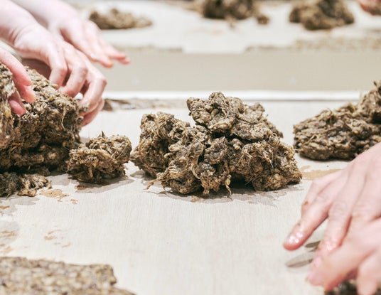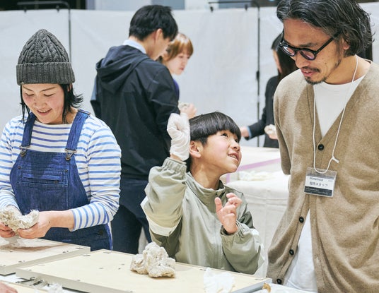 そして早速、自分たちでほぐした残渣をデンプン糊と混ぜ合わせていきます。大人も子どもも一緒に、泥遊びのような感覚で楽しむ様子が伺えました。準備ができたら、それを什器の表面に貼っていきます。粘度のある残渣を什器の扉や側面に押し付け、隙間をつくらないようにします。均一の高さになるように丁寧に貼る方や、あえて凹凸をつくるように残渣を重ねる方、オープンしたときに自分がつくった扉だと分かるようにちょっとしたサインを残す方、残渣だからこそ混ざっている綿の殻を活かしてデザインする方など、それぞれの個性が光る味のある什器が完成しそうです。