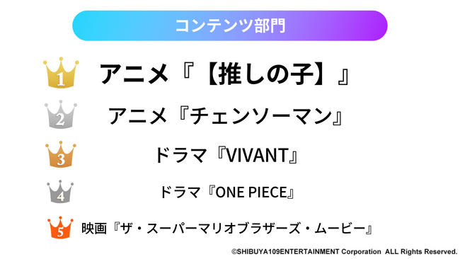 ノミネートには漫画原作のアニメやドラマが多く挙げられており、ノミネートには1990~2000年代にかけてトレンドとなった作品も挙げられています。作品の展開に関する考察が楽しめる作品が多いのも特徴です。ドラマやアニメ・映画などのコンテンツについては、ショート動画を中心に劇中挿入歌や切り抜き動画がきっかけとなり、コンテンツを詳しく知らない人たちにも楽しまれ、トレンドになっていく流れが定番化しています。