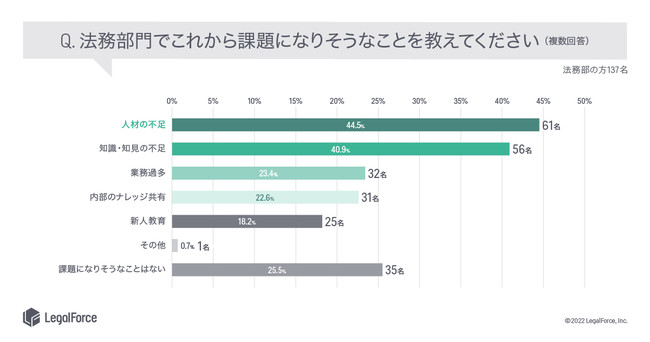 ・法務部門でこれから課題になりそうなことは「人材の不足」が44.5%