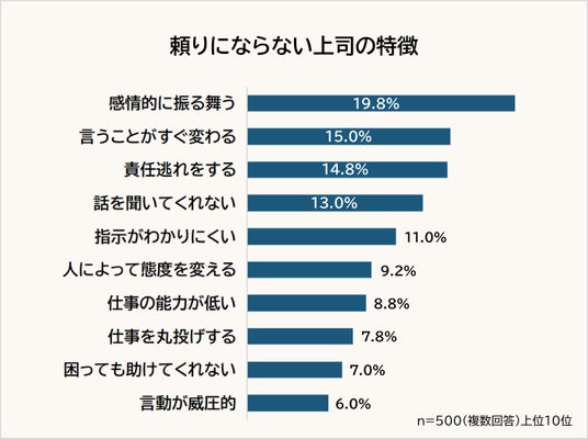 そこで今回、株式会社ビズヒッツ( https://bizhits.co.jp/ )が運営するBiz Hits採用特化Web広告運用代行サービス( https://bizhits-websaiyou.com/ )は、お仕事をしている男女500人に「頼りになる上司とならない上司」についてアンケート調査を実施。その結果をランキング形式でまとめました。
