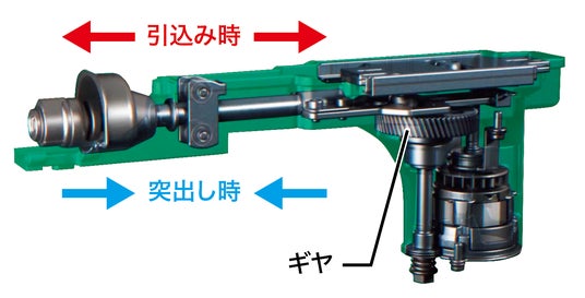 1つのギヤに2つの出力軸を設け、下段をブレード駆動軸、上段をウェイト駆動軸として互いに反対方向へ動作 させることで、切断時に発生する振動を効果的に抑制します。
