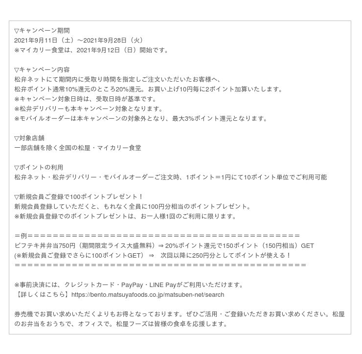 このたび松屋フーズ(本社:東京都武蔵野市、代表取締役社長:瓦葺一利)では、牛めし・カレー・定食・その他丼の「松屋」におきまして、お弁当WEB予約サイト“松弁ネット”にて導入いたしております松弁ポイントの「20%還元キャンペーン」を9月11日(土)~9月28日(火)までの期間限定で開催いたします。