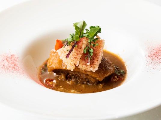 郷土料理「ぬか炊き」をアレンジし、発酵や酵素の力を取り入れ、味はもちろん、健康面にも配慮。米の生産時に排出され、有害鳥獣駆除にも利用されている米糠を使用しストーリー性を持たせました。酵素で猪肉を柔らかくし、対照的におこげやピッキーニョなど食感の差を出し、また野菜由来の甘さや辛味でアクセントを持たせ、食べ飽きさせないよう工夫した一品です。