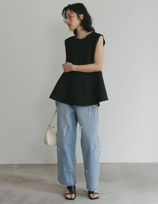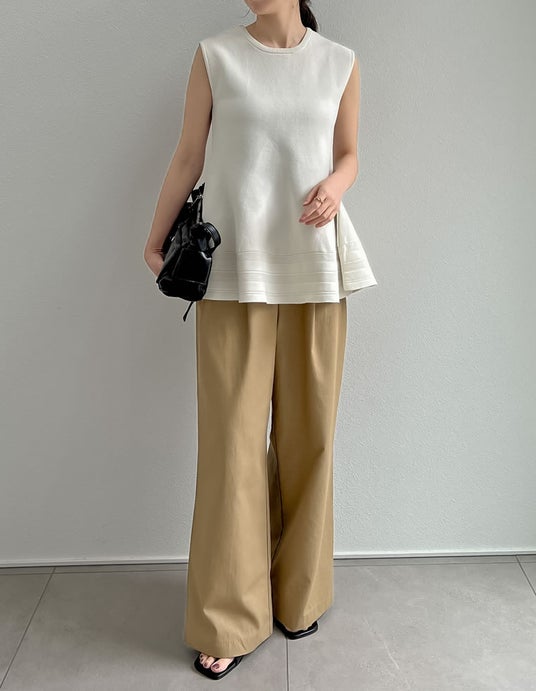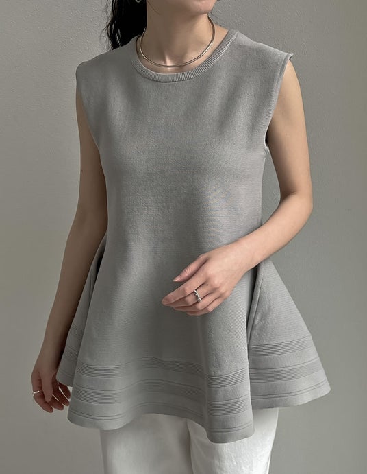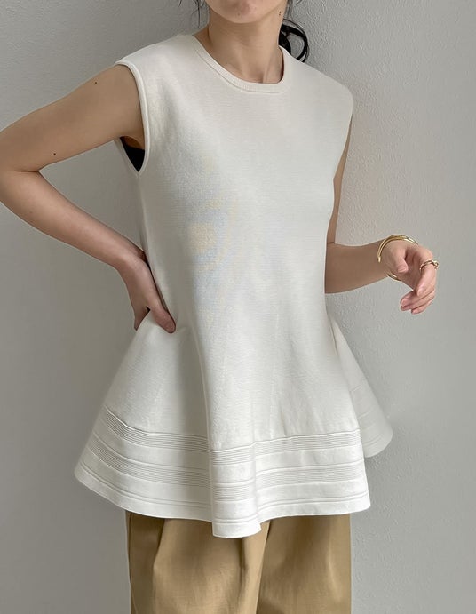 ウエストから緩やかに広がるペプラムシルエットで、エレガントに仕上げたサマーニットトップス。