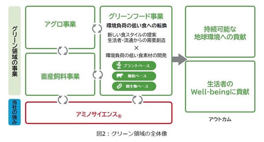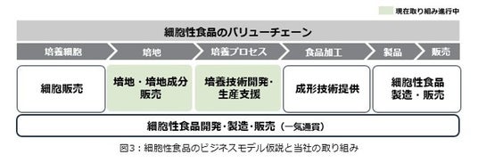 当社は「アミノサイエンス(R)で、人・社会・地球のWell-beingに貢献する」という志(パーパス)の下、中期ASV経営 2030ロードマップにおいて、市場の成長性と社会価値の高い4つの重点成長領域で飛躍的成長を目指す基本方針を掲げています。本技術の開発はその一つ、グリーン領域の中核となるグリーンフード事業を加速させる環境負荷の低い食素材の開発活動として位置づけられます(図2)。細胞性食品のバリューチェーンの中には、細胞そのものの販売をはじめ、培地や成長因子等の培地成分の販売、それらを使った培養技術開発・生産支援サービス、さらには食品加工、細胞性食品の製造・販売に至るまで複数のプロセスが存在し、当社にも多様な事業機会が広がっています。それらいずれも当社の強みであるアミノサイエンス(R)が十分生かせる分野であり、まずはバイオ医薬/再生医療用培地事業で培った技術と知見を活用し、培地・培地成分販売や培養技術開発・生産支援での事業参入を目指します(図3)。当社は今後も細胞性食品の社会実装を支援し、持続可能なアグリフードシステムの構築に貢献します。