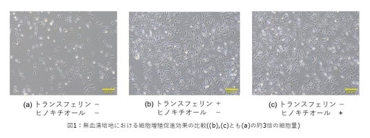 ヒノキチオールは、植物に含まれる天然成分で、鉄と結合して細胞内に鉄を届ける働きを持っています。この特性を生かすことで、従来トランスフェリンが持つ本機能を代替し、無血清培地で高い細胞増殖率を維持できることを確認しました(図1)。この研究成果は、2025年11月に開催されたInternational Scientific Conference on Cultured Meat (ISCCM)で発表しております。