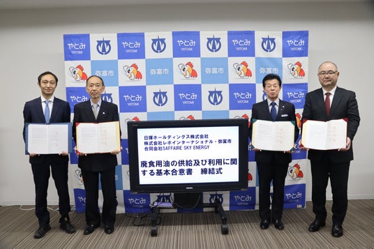 愛知県弥富市(市長:安藤 正明)、日揮ホールディングス株式会社(代表取締役会長CEO:佐藤 雅之、以下「日揮HD」)、株式会社レボインターナショナル(代表取締役CEO:越川 哲也、以下「レボインターナショナル」)および、合同会社SAFFAIRE SKY ENERGY(代表者:秋鹿 正敬、以下「SAFFAIRE SKY ENERGY」)は、持続可能な航空燃料SAF(Sustainable Aviation Fuel、以下「SAF」)等の原料となる使用済み食用油(以下「廃食用油」)の資源化促進を図るため、「廃食用油の供給及び利用に関する基本合意書」を2025年3月27日に締結し、同日に弥富市役所で合意書締結式を執り行いました。