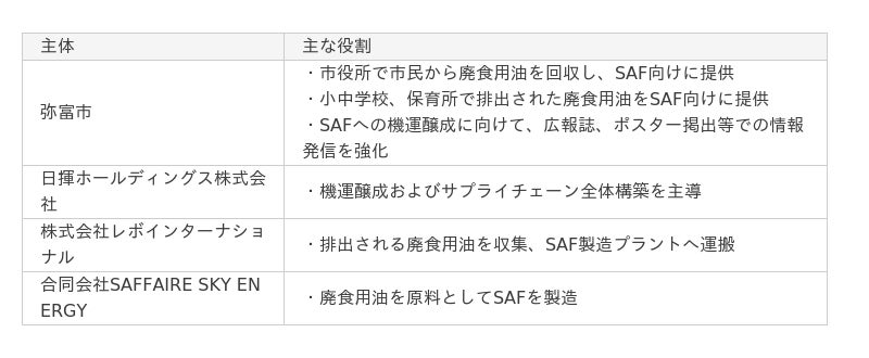 廃食用油の国内資源循環による脱炭素社会の実現に向けたプロジェクト「Fry to Fly Project」ならびに国産SAFの商用化および普及・拡大に取り組む有志団体「ACT FOR SKY」に参画している中部国際空港によって、愛知県内自治体である弥富市と、国内で唯一の国産SAF量産設備を有するSAFFAIRE SKY ENERGY、出資者である日揮HDおよびレボインターナショナルの引き合わせがなされ、このたび、弥富市の家庭等から排出される廃食用油を回収してSAFに資源循環させるための基本合意書を締結することとなりました。