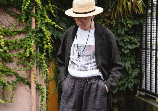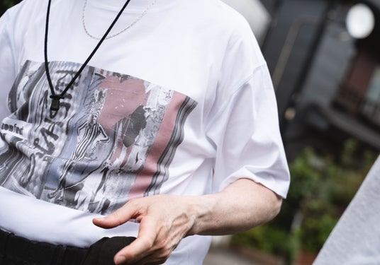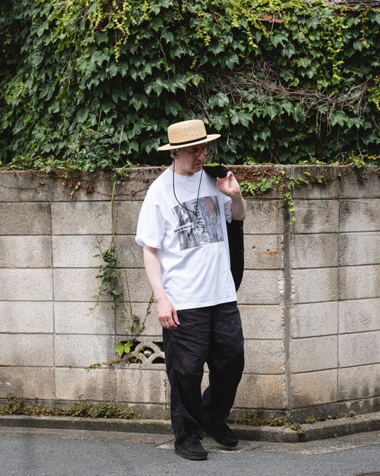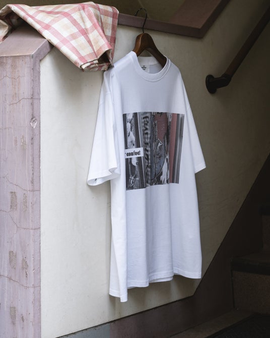 QUILPのフィルターを通したグラフィックを、森下氏が展開するもう一つのブランド「HOPPER'S BRUNCH」のTシャツボディにプリント。3本の原糸を撚り合わせることで滑らかなタッチを生んだファブリックにより、さらりと軽やかな一着に仕上がっています。
