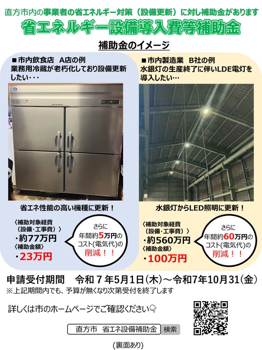 直方市は、2050年までに二酸化炭素排出量を実質ゼロにすることを目指し、脱炭素社会の実現に向けた取り組みを進めています。昨年度に引き続き、「直方市省エネルギー設備導入費等補助金」として、市内の事業者向けに省エネ設備・機器への更新にかかる費用の補助を実施します。