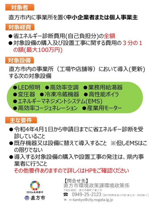 直方市内の中小企業等が、受診した省エネルギー診断の結果に基づいて導入する機器・設備に係る費用等を対象に補助金を交付します。国や県との補助金も併用可能です。