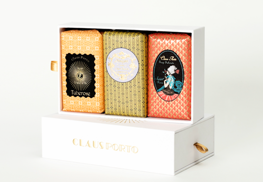 19世紀からの伝統を再現したクラシコ コレクションは、香料をふんだんに使用し、ピスタチオオイル(ピスタチオ種子油)やマンゴーオイル(マンゴー種子油)をブレンドした16種類のソープを提案しています。クラウス ポルトの豊富なアーカイブにあるポルトガルの建築様式や伝統的な図柄を連想させるヴィンテージデザインのパッケージに職人が手作業でラッピングし、封蝋で仕上げます。