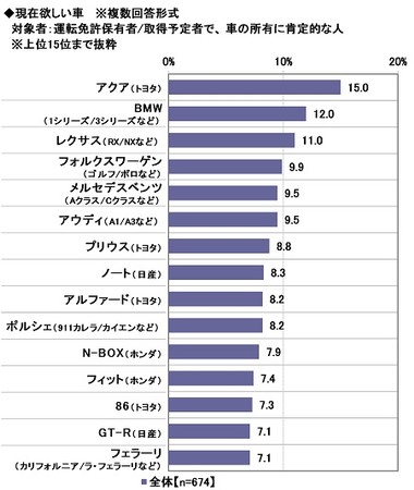 運転免許保有者と取得予定者836名のうち、『車の所有に肯定的』な674名に、現在欲しい車を聞いたところ、1位は「アクア(トヨタ)」(15.0%)、2位は「BMW(1シリーズ/3シリーズなど)」(12.0%)、3位は「レクサス(RX/NXなど)」(11.0%)、4位は「フォルクスワーゲン(ゴルフ/ポロなど)」(9.9%)、5位は「メルセデスベンツ(Aクラス/Cクラスなど)」「アウディ(A1/A3など)」(いずれも9.5%)となりました(※3)。