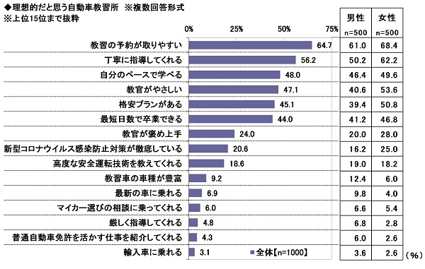 男女別にみると、女性では「丁寧に指導してくれる」が62.2%、「教官がやさしい」が53.6%、「格安プランがある」が50.8%と、男性(順に50.2%、40.6%、39.4%)と比べて10ポイント以上高くなりました。